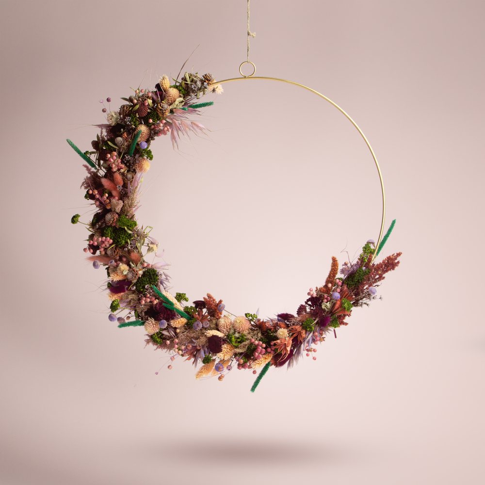 Garland entirely hand-decorated with dried and stabilized flowers.