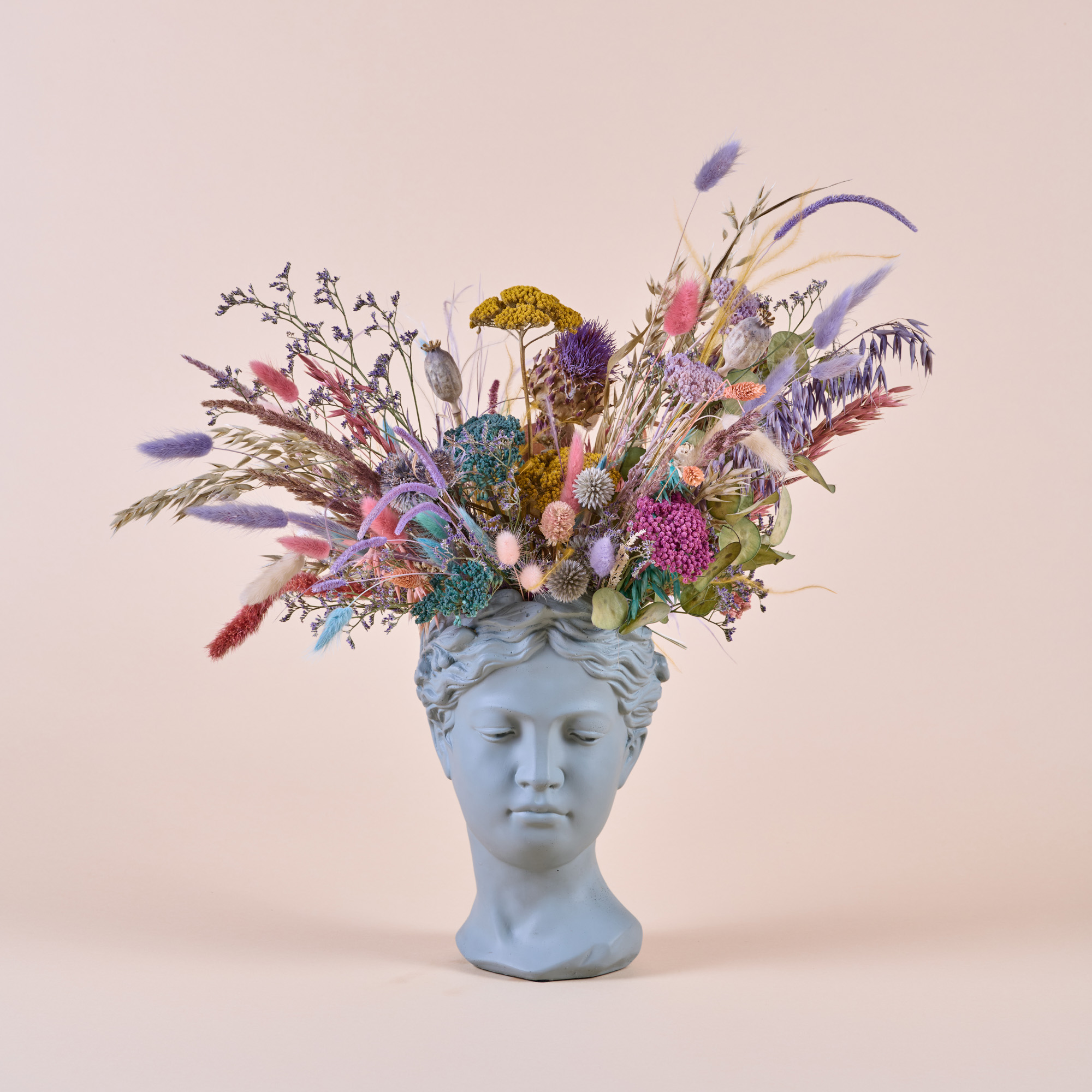 Testa color azzurro polveroso in cemento con composizione di fiori stabilizzati e secchi.