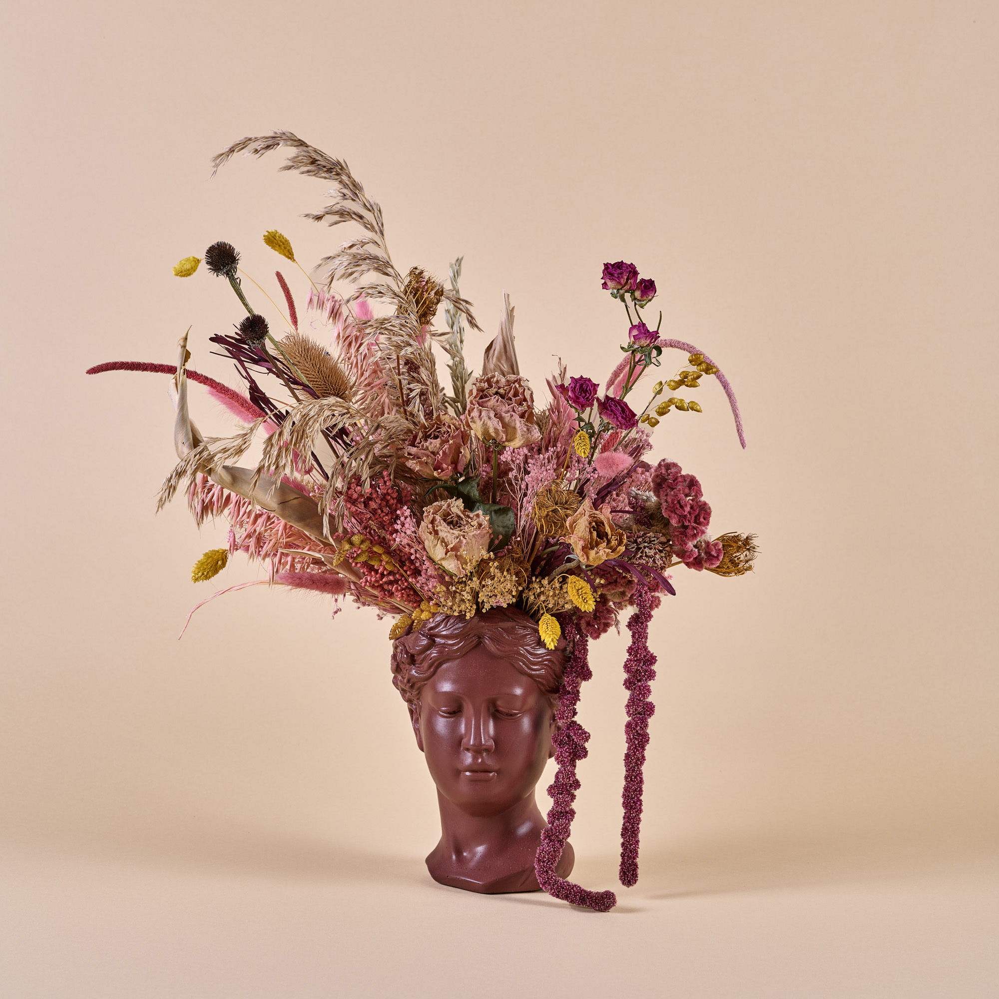 Testa color mattone in cemento con composizione di fiori stabilizzati e secchi.